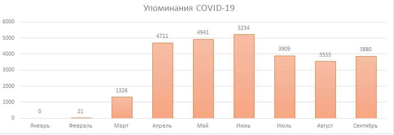 Западно-Уральский информационный центр (ЗУИЦ) по просьбе Business Class проанализировал количество упоминаний вируса COVID-19 в медиа Перми. Выяснилось, что пиковые показатели были зафиксированы в июне – более 5 тысяч публикаций в СМИ. Затем они пошли на спад, но с наступлением осени вновь начался подъем. Но до пиковых значений количество информационных сообщений пока еще не дошло.