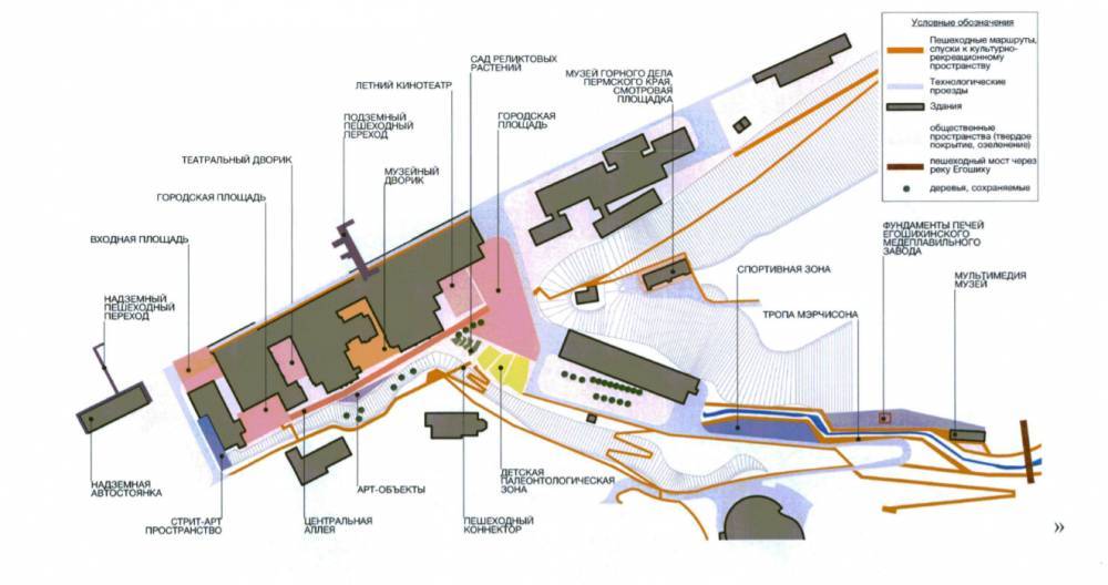 Помимо этого, на территории культурно-рекреационного кластера запланировано поэтапное строительство сетей водоснабжения, водоотведения, тепло- и электроснабжения, ливневой канализации. Предусмотрено благоустройство территории общего пользования со строительством канала для раскрытия русла реки Егошихи.