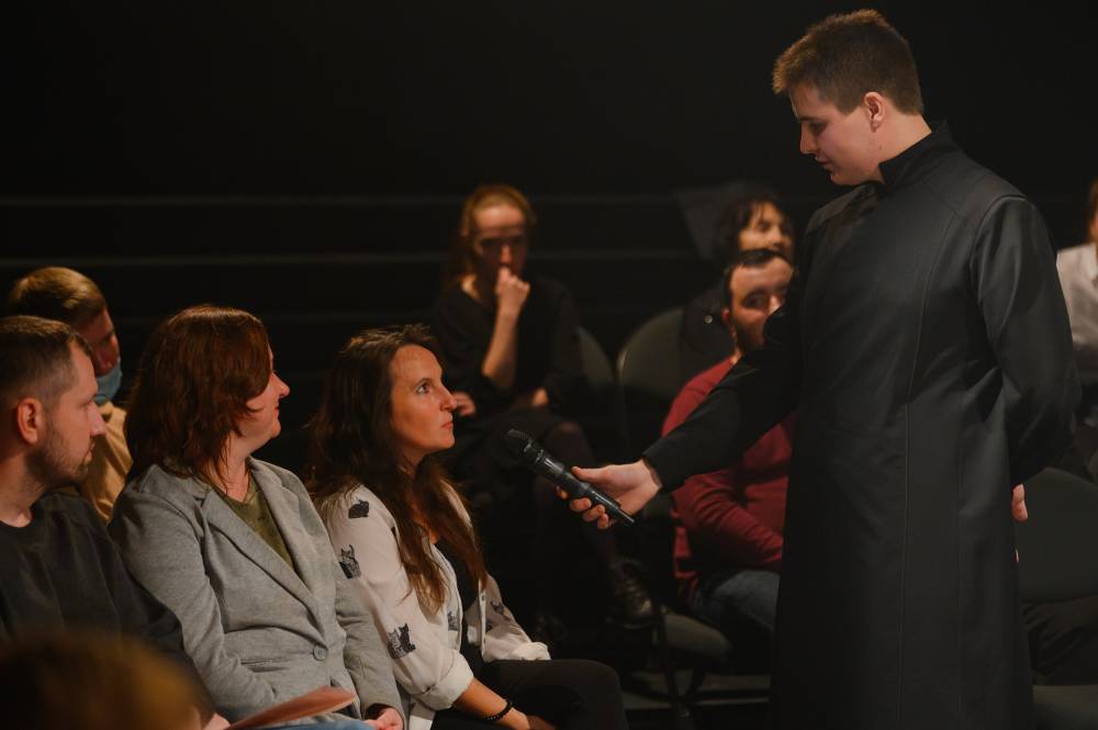 Мастерски выстроенная игра со светом (художник по свету – Елена Перельман) создает впечатление, что зрители находятся в черной комнате – квадрате, откуда сложно найти выход, особенно если искать ответы на вечные философские вопросы. При этом не возникает ощущения подавленности, замкнутого пространства и тупика. Элегантный юмор, прекрасная игра актеров, что называется «на кураже», – и зрители начинают верить, что действующие лица такие же «простые» люди, как они, а подобный диалог мог бы вести каждый. Но градус накала страстей повышается, режиссер Катя Мохорт «подключает» новые раздражители – звуки, и разговор персонажей становится не такой приятный и понятный, а отвечать на вопросы приходится уже ведущему ток-шоу.