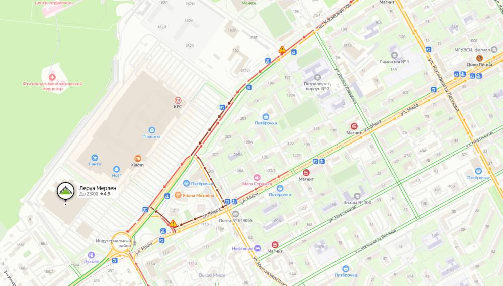 В районе гипермаркета «Леруа Мерлен» образовался крупный транспортный затор. По данным сервиса «Яндекс.Пробки», движение автомобильного транспорта затруднено от перекрестка шоссе Космонавтов с ул. Леонова до разворотного кольца в районе гипермаркета.