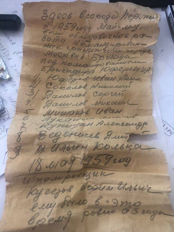 Бутылку случайно повредили отбойным молотком, сама же записка хорошо сохранилась. На пожелтевшей бумаге простым карандашом выведено: «Здесь в Перми в мае 1959 года вели облицовочные работы командированные гранитчики города Москвы». Далее – список имен и фамилий всех рабочих. Записка датирована 18 мая 1959 года.