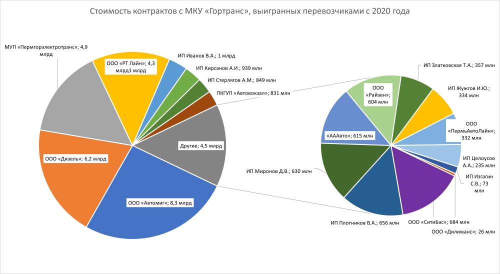 Лидером по стоимости выигранных контрактов оказалось ООО «Автомиг» – 8,3 млрд рублей. Все объемы работ в Перми компания получила на старте реформы в 2020 году. Далее следует ООО «Дизель», в портфеле которого имеются разные по длительности контракты. В 2020 году предприятие начало работу по трехлетним договорам, еще часть маршрутов долгое время обслуживало на основании коротких соглашений, а недавно «зашло» в пятилетние контракты. Замыкает тройку лидеров МУП «Пермгорэлектротранс». Муниципальный перевозчик с 2020 года получил объемы на 4,9 млрд рублей. С ООО «РТ Лайн» в 2020 году подписаны пятилетние соглашения на сумму порядка 4,3 млрд рублей. Среди индивидуальных предпринимателей самый значительный объем работы у Виктора Иванова – более 1 млрд рублей, близка к этой сумме и стоимость контракта с Алексеем Кирсановым. У семи юрлиц и ИП показатель варьируется в пределах от 600 до 850 млн рублей, у трех – от 200 до 350 млн рублей, у двух – менее 100 млн рублей.