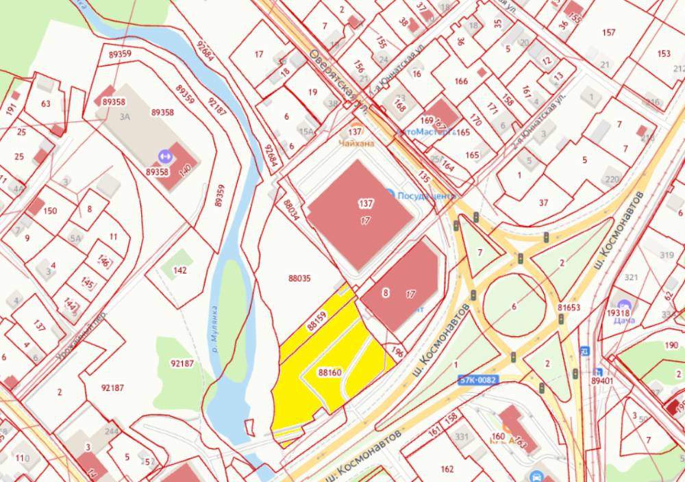 Речь идет о земельных участках по ул. Юннатской, 1-й. Они находятся вблизи бывшего гипермаркета «Виват» по шоссе Космонавтов, 240 и торгового центра «Кольцо». На кадастровой карте эти попавшие под изъятие площадки выделены желтым.