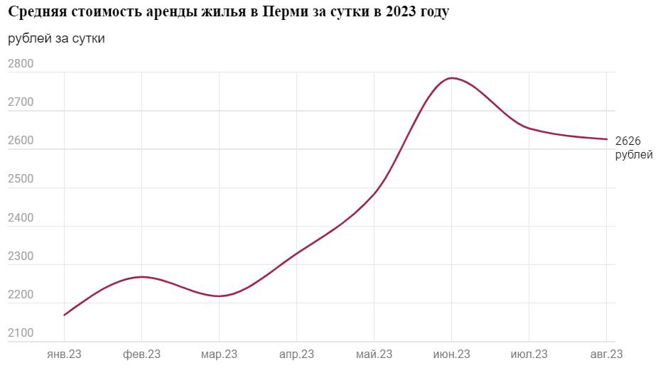 По данным сервиса онлайн-бронирования жилья «Суточно.ру», средняя стоимость посуточной аренды в Перми в августе этого года составляет 2,6 тыс. рублей. По сравнению с январем прирост составил 21%. За год спрос на посуточное жилье в Перми вырос примерно на 15%, добавил генеральный директор российского сервиса онлайн-бронирования жилья «Суточно.ру» Юрий Кузнецов.