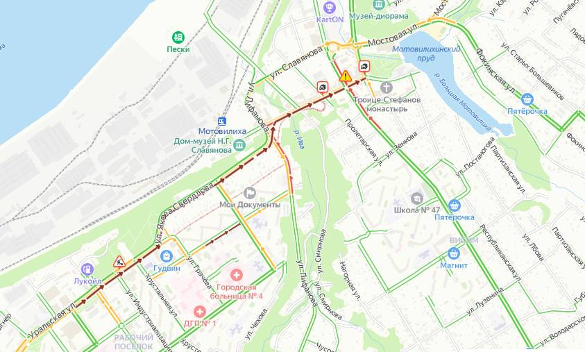 По данным сервиса «Яндекс Пробки», пробка начинается от ул. Уральской, 85 (в районе пожарной части № 3) и заканчивается в районе Райского сада. На карте указаны сразу два дорожно-транспортных происшествия. По словам очевидцев, недалеко от Центрального универмага Мотовилихи сломался КамАЗ, а на перекрестке улиц Соликамской и 1905 года – авария в среднем ряду.