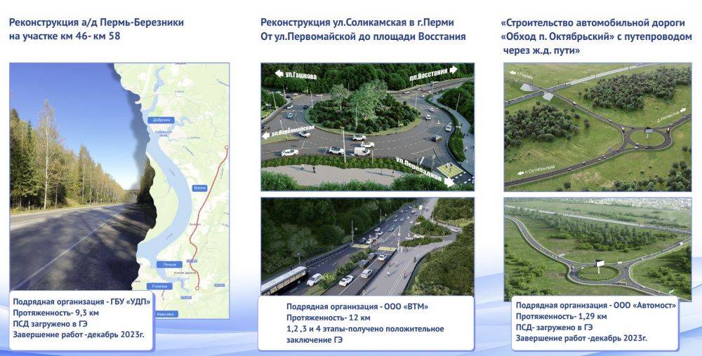 Из крупных объектов реконструкции и строительства он отметил наиболее значимые, которые будут сданы в ближайшие два года. Их девять: ул. Строителей (третий этап); тоннели по ул. Вишерской и ул. Углеуральской; очистные сооружения по ул. Строителей; ул. Крисанова; трасса ТР-53 (первый этап); дополнительный выезд из Осенцов; реконструкция участка дороги Кунгур – Соликамск на въезде в Соликамск; реконструкция ул. Карпинского от ул. Мира до шоссе Космонавтов; дорога к верхнему кластеру курорта «Губаха».