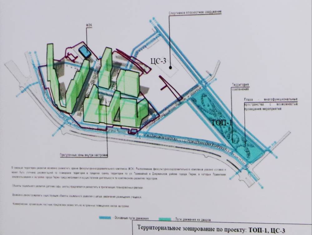Согласно заявлению компания запросила установление территориальной зоны КРТ в квартале, ограниченном улицами Телеграфной, Трамвайной, Желябова и Строителей. Кроме того, для обустройства сквера и строительства физкультурно-оздоровительного комплекса девелопер попросил установить территориальные зоны общего пользования (ТОП-1) и спортивных и спортивно-зрелищных учреждений (ЦС-3) в отношении участков, ограниченных улицами Строителей, Песчаной и Шпалопропиточной. Этот проект отправили напрямую в правительство региона.