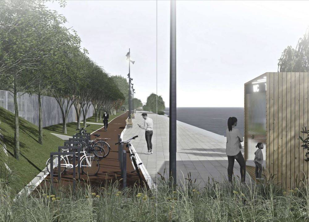 Первый этап работ включает в себя устройство променада, площадки для катания на роликах/коньках, создание детской площадки, строительство многофункционального павильона с кафе, пункта проката и туалетных модулей. Второй этап затрагивает элементы, относящиеся к инфраструктуре ул. Монастырской: автомобильную парковку, тротуар, велодорожку.