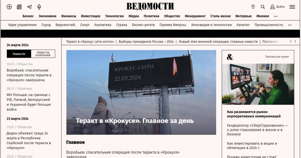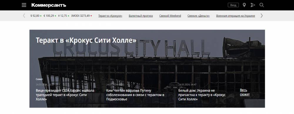 Сайты ведущих российских газет – «Известия», «Ведомости», «Коммерсантъ», окрасились в черный в связи с общенациональным днем траура 24 марта, свидетельствуют порталы изданий.