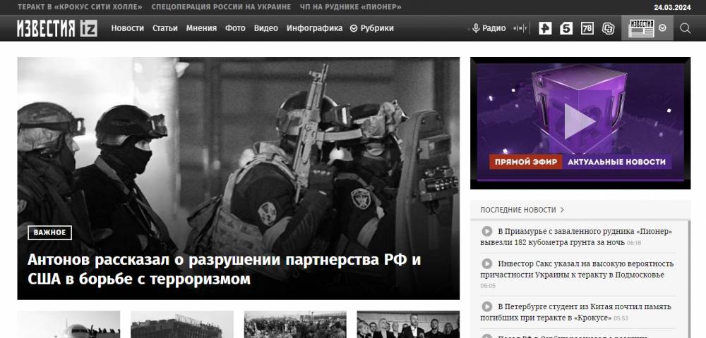 Сайт газеты «Известия» полностью изменил цвета главной страницы, в том числе и на фотографии к публикациям: