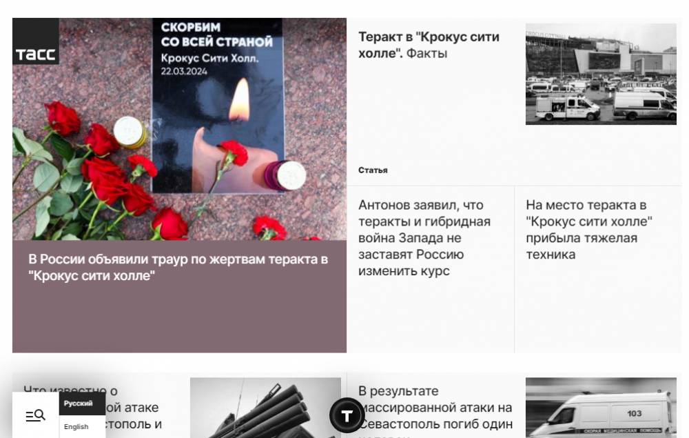 Также изменил цвета сайт ТАСС – главная страница агентства стала черной: