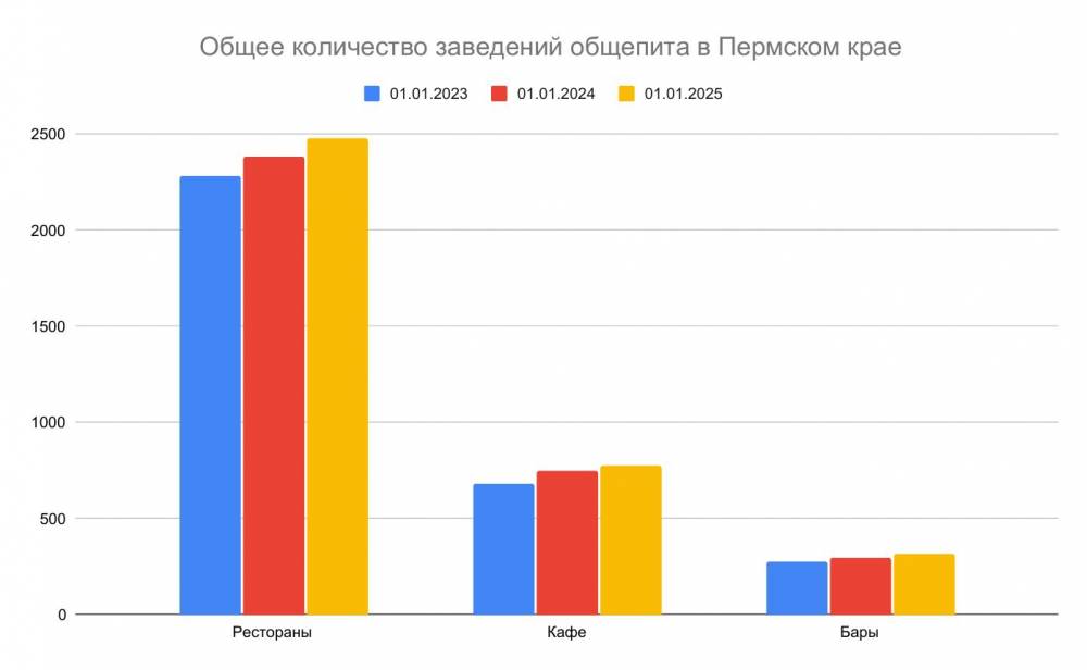 Аналитики сервиса «Контур.Фокус» зафиксировали отрицательную динамику на пермском рынке общепита. Согласно предоставленным Business Class подсчетам, общее количество предприятий общепита на первый квартал 2025 года составило 3570, это на 4,02 % больше, чем в аналогичном периоде прошлого года. Самый большой прирост за год зафиксирован среди баров (плюс 6,04 %), в то время как число зарегистрированных ресторанов и кафе возросло примерно одинаково: на 3,94 % и на 3,48 %.