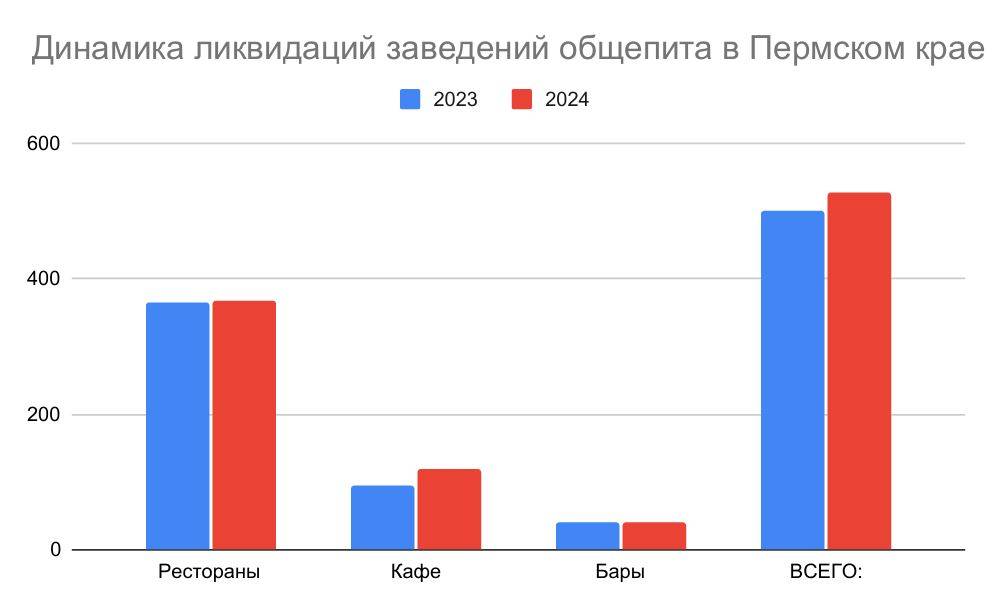 Специалисты отмечают, что динамика развития общепита в Пермском крае за последние несколько лет замедлилась. Так, в 2024 году новых заведений насчитывалось на 8,33 % меньше, чем в предыдущем году, а количество ликвидированных, наоборот, возросло на 5,60 %. Самый низкий рост показали пермские кафе с годовой динамикой -14,81 %. В 2023 году новых зарегистрированных кафе насчитывалось 162, а в 2024 году – 138. Показатели роста в сегментах ресторанов и баров тоже отрицательные, но менее выраженные: -6,79 % и -3,17 %.