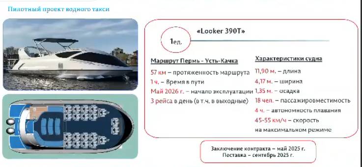 В мае Пермский край заключит контракт на покупку первого скоростного судна малой вместимости Looker 390T. Об этом на заседании регионального правительства сообщил глава Минтранса Сергей Вешняков. Судно должны поставить в сентябре 2025 года, его планируют запустить в рамках пилотного проекта по созданию водного такси.