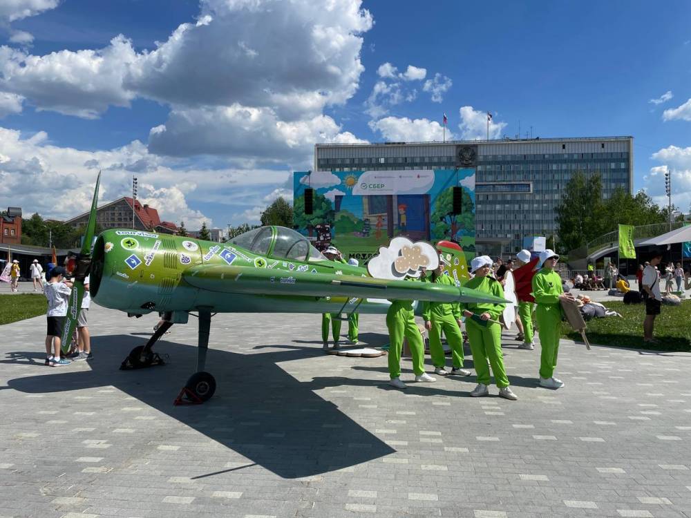 Главный арт-объект фестиваля зеленый самолет, как главный атрибут путешествия Медвежонка.