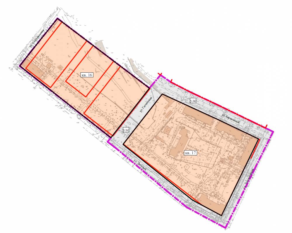 Кварталы 16 и 17 ограничены ул. Татьяны Барамзиной, ул. Локомотивной и ул. Энгельса. Общая площадь – 5,2 га. Ранее на территории находились аварийные дома, которые расселили и снесли.