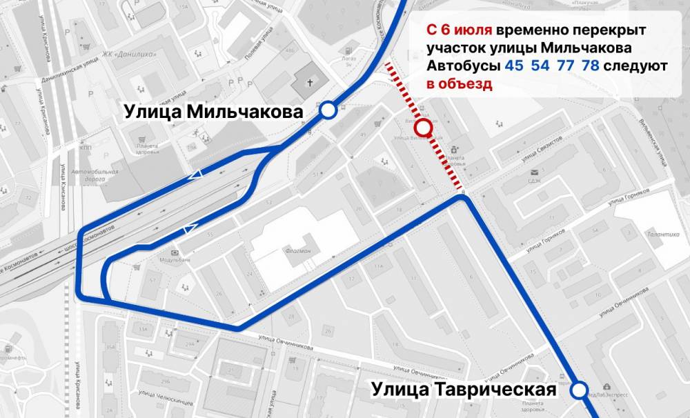 Автобусы № 45, 54, 77 и 78 будут следовать в объезд по улицам Овчинникова и Связистов в связи с закрытием перекрестка ул. Мильчакова и шоссе Космонавтов. На участке запланированы работы по переустройству коммуникаций и строительству перекрестка.