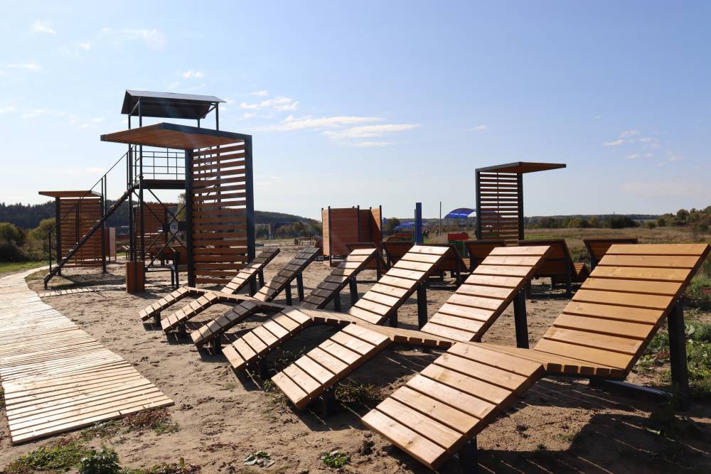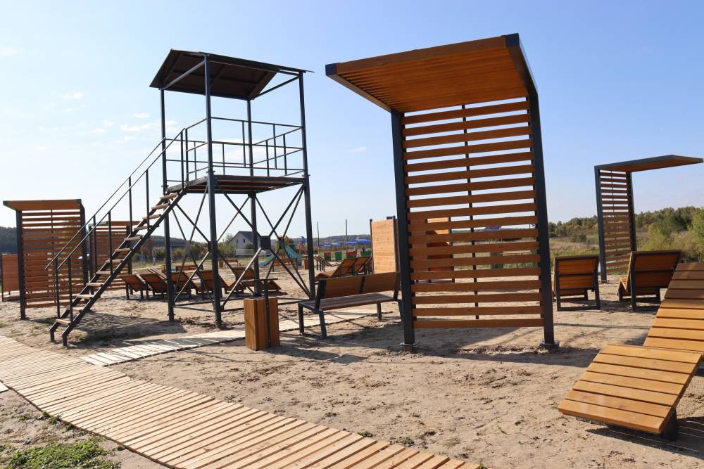 Территория вдоль берега оснащена всем необходимым оборудованием для досуга: установлена входная группа, размещены информационные стенды, возведена спасательная вышка, установлены скамейки и шезлонги, построены кабинки для переодевания, сооружены теневые навесы и площадки для занятий спортом, включая пляжный волейбол. Для маленьких посетителей оборудован детский игровой комплекс, предусмотрены деревянные настилы, биотуалеты, специальные емкости для мусора и контейнеры для твердых коммунальных отходов. Особое внимание уделено созданию зон для семейных прогулок, активных видов спорта и фотозоны.